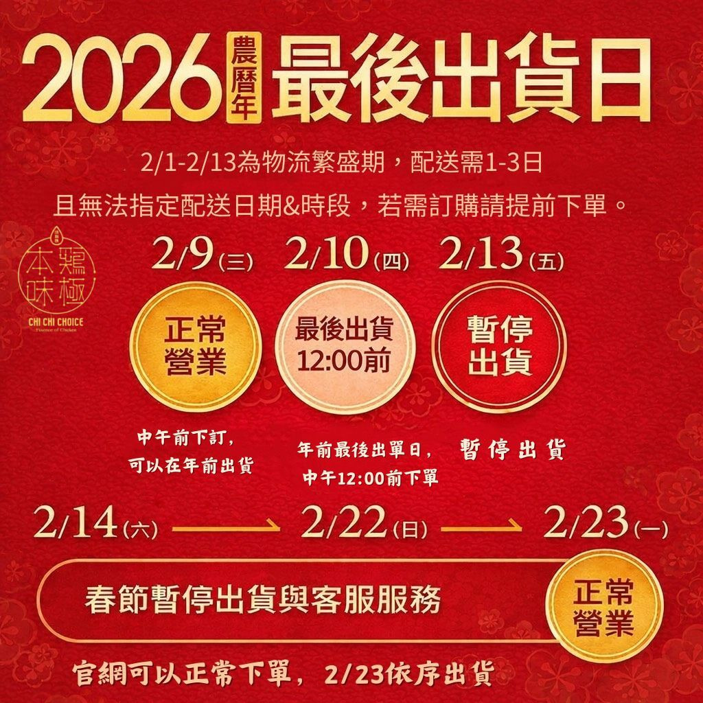 因應 2026 年農曆春節前物流繁盛期,為確保訂單配送品質與時程,雞極本味特此公告農曆年前最後出貨日與春節期間相關服務安排,敬請您提前留意並安排訂購。